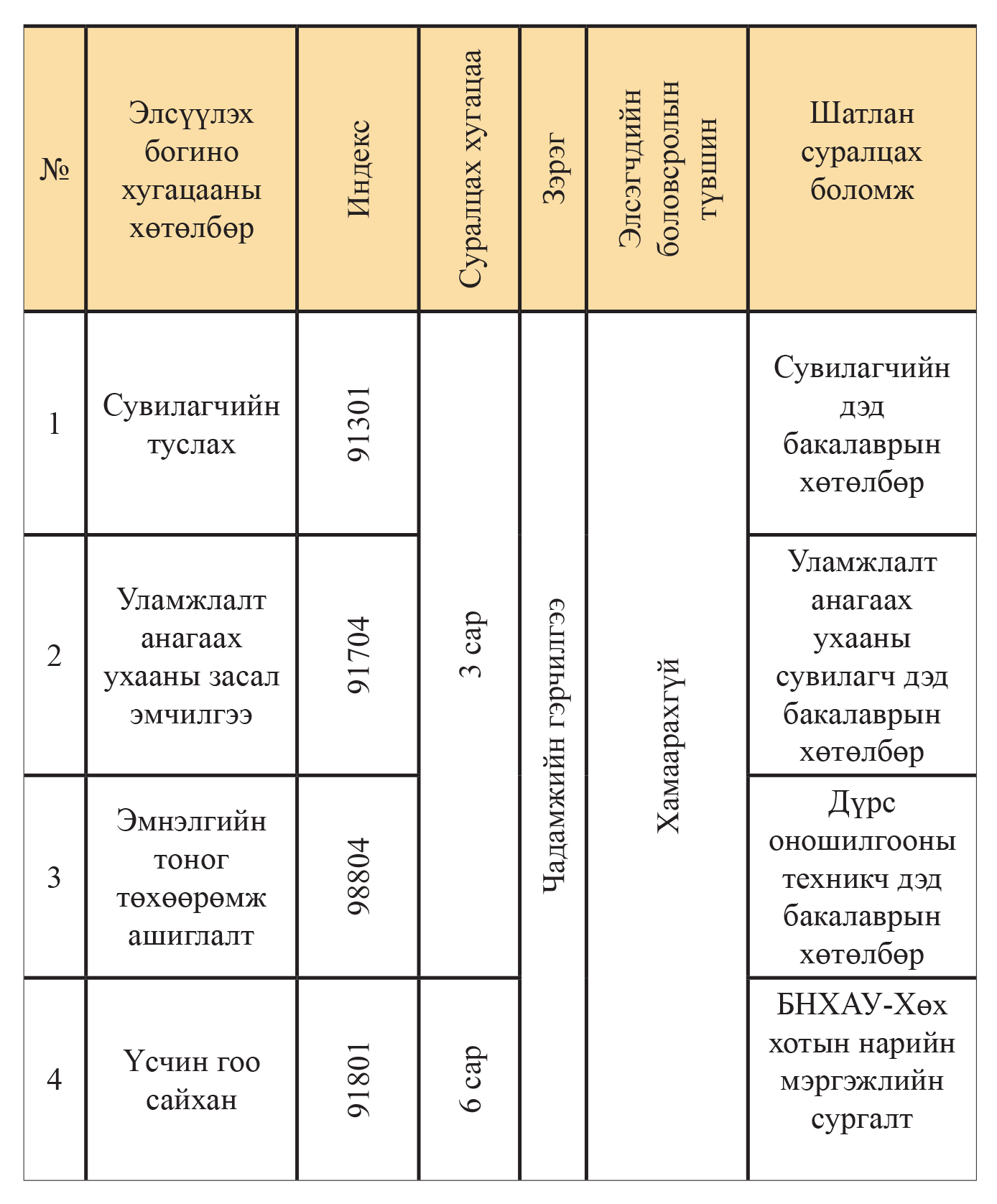 The total number of hours of a given professional program is regulated by the EDS training regulations. In the 2025–2026 academic year, the student’s fee for one hour of the program is 130,000 tugriks and can be paid in installments for each semester. / The possible payment period will be regulated by contract /