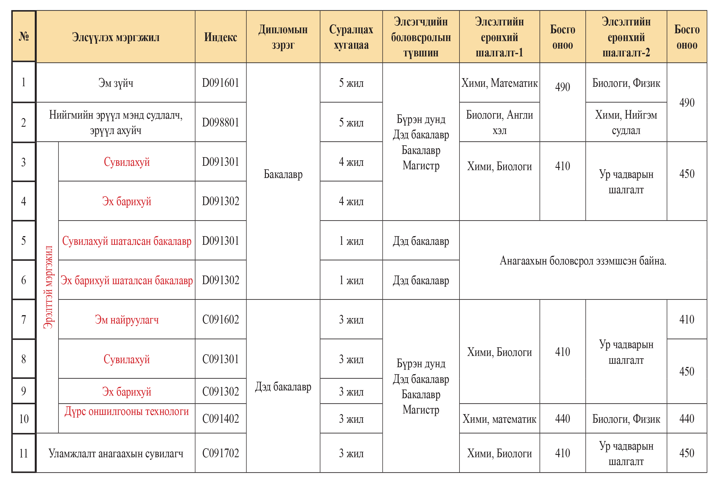 Боловсрол шинжлэх ухааны сайдын 2024 оны 03 дугаар сарын 20 өдрийн А/143 дугар тушаалыг үндэслэн АУ-ны Энэрэл дээд сургууль нь 2025-2026 оны хичээлийн жилд бакалавр, дэд бакалаврын хөтөлбөрүүддээ Монгол улсын Боловсролын сайдын 2024 оны 13 сарын 05-ны өдрийн “Босго оноо тогтоох тухай” А/228 дугаар тушаалын дагуу босго оноог хангасан суралцагчдыг элсүүлэн авна. Түүнчлэн дээд боловсролтой иргэн, тухайн мэргэжлээр Политехник коллеж төгсөгчид, элсэн суралцах мэргэжлийн чиглэлээр 3-аас доошгүй жил ажилласан, 30-аас дээш насны иргэдийг ЭЕШ-гүй элсүүлнэ.